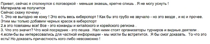 2 недели назад, на условиях анонимности, мне написали два человека, полностью уверенные в том, что переписываются с организатором договорных матчей в Dota 2 и CS:GO.