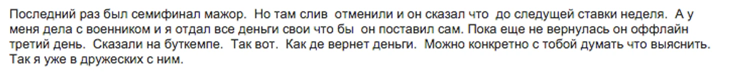 Один из моих «клиентов» бедный школьник, накопивший деньги с продажи внутриигровых предметов, другой относительно богатый. С первым разбираюсь довольно быстро, ставя жесткие условия, а со вторым подробно общаюсь в личке, рассказывая слухи о командах, приводя примеры предыдущих успешных матчей и всячески завоевываю его доверие.