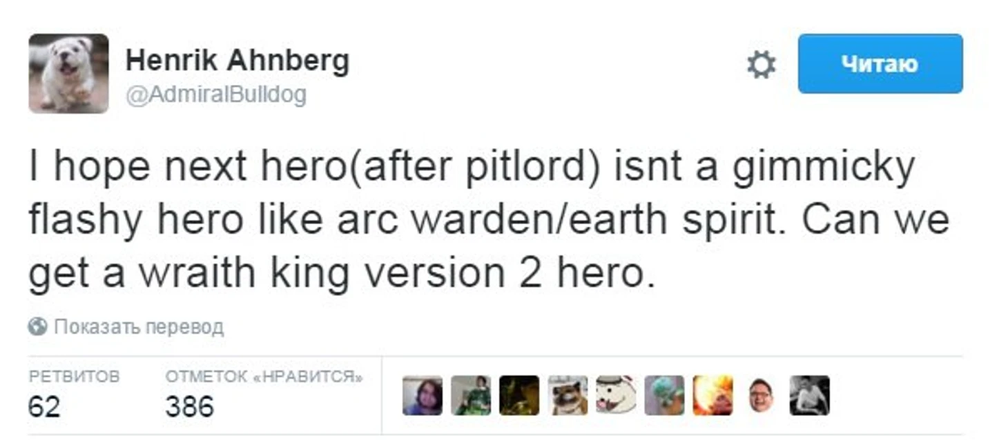 Этот же матч подарил Reddit еще одно обсуждение. AdmiralBulldog в твиттере написал, что хочет видеть героя попроще, без всяких трюков. Что-то вроде нового Wraith King. Reddit принялся обсуждать, чего именно не хватает игре.