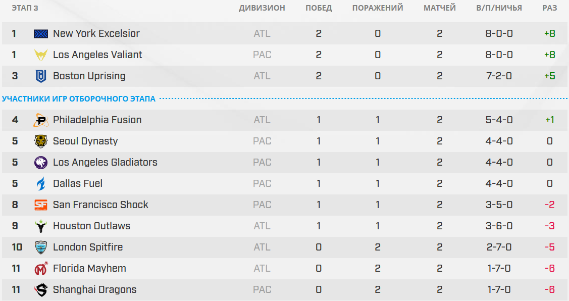 5 апреля Shanghai Dragons 1:3 Dallas FuelLos Angeles Valiant 4:0 Seoul DynastySan Francisco Shock 3:1 Los Angeles Gladiators 6 апреля Florida Mayhem 0:4 New York ExcelsiorPhiladelphia Fusion 2:3 Boston UprisingLondon Spitfire 2:3 Houston Outlaws 7 апреля Los Angeles Gladiators 3:1 Dallas FuelLos Angeles Valiant 4:0 Shanghai Dragons Seoul Dynasty 4:0 San Francisco ShockFlorida Mayhem 1:3 Philadelphia Fusion 8 апреля Houston Outlaws 0:4 Boston UprisingNew York Excelsior 4:0 London Spitfire