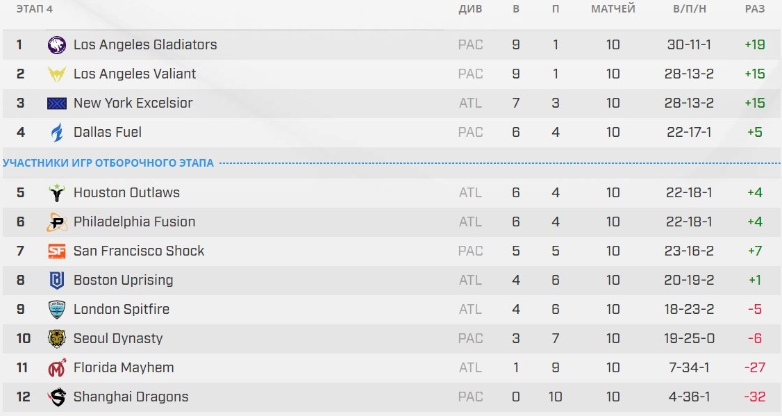 Houston Outlaws 2:3 New York ExcelsiorLos Angeles Gladiators 3:1 Seoul DynastyDallas Fuel 3:1 Los Angeles Valiant