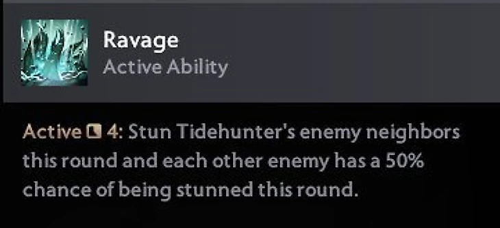 Tidehunter. Ravage: Оглушает соседних врагов, все остальные враги могут быть оглушены на этом раунде с вероятностью 50%.
