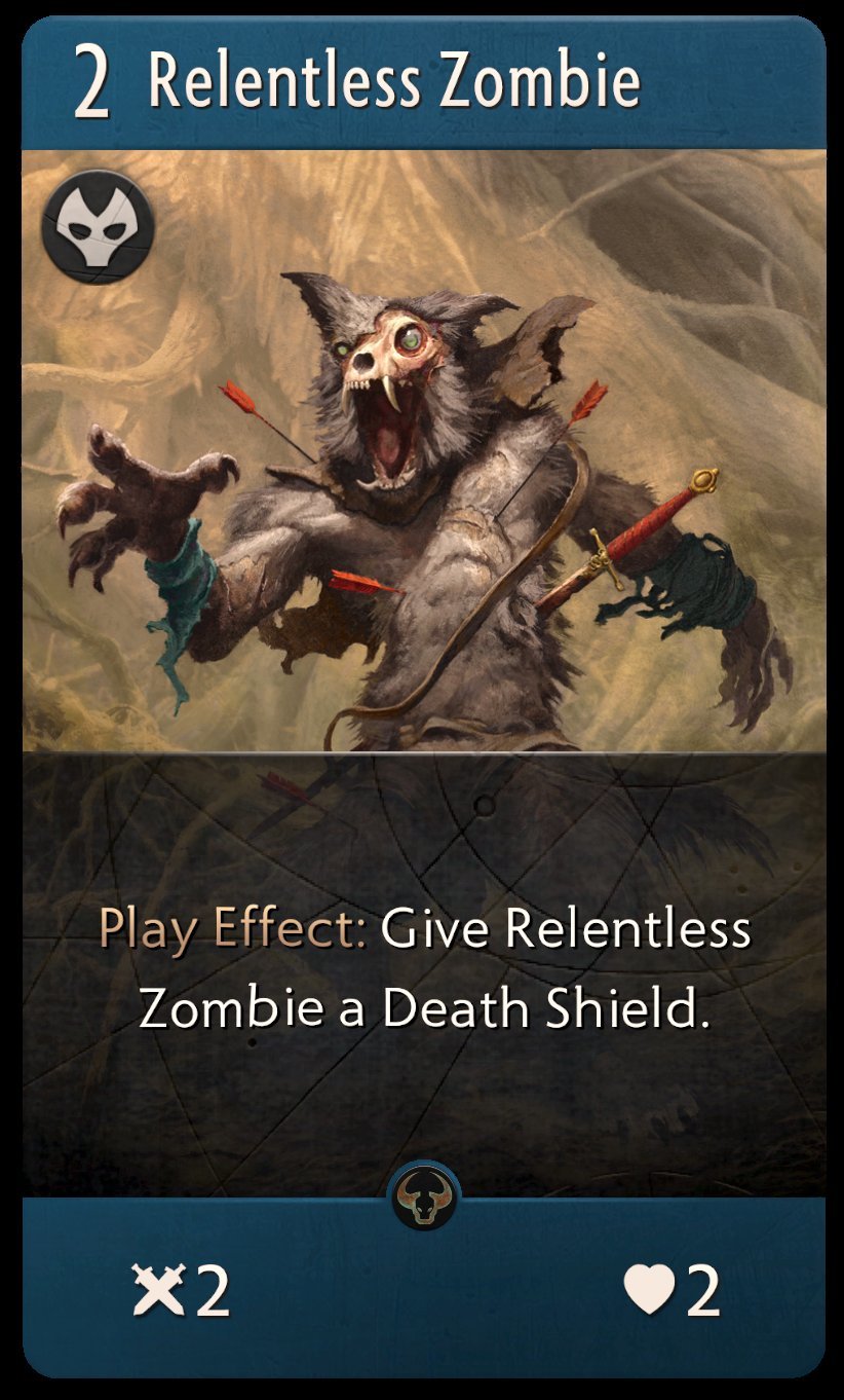 Синее существо Relentless Zombie: Эффект при разыгрывании: Дает Relentless Zombie Death Shield.