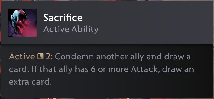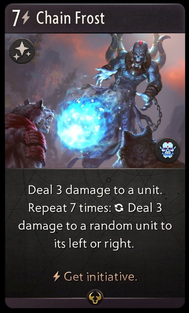 Lich. Chain Frost: Наносит 3 урона юниту. Pulse. Повторяется 7 раз: Наносит 3 урона случайному юниту слева или справа. Дает инициативу.Lich. Sacrifice: Уничтожает другого союзника. Вы получаете карту. Если у союзника 6 или более атаки, вы берете еще одну карту.