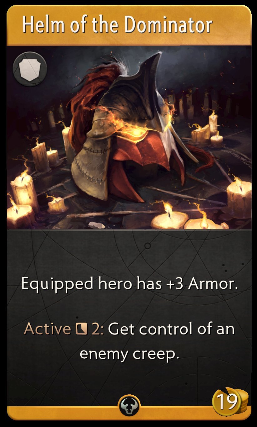 Предмет Helm of Dominator: Герой с предметом получает +3 к Броне.Активная способность: Контроль вражеского крипа.