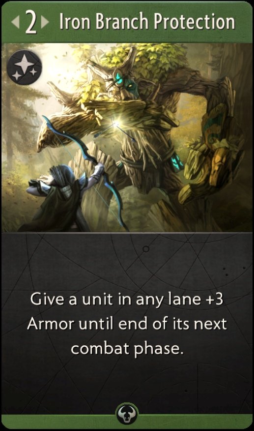 Зеленая карта Iron Branch Protection: До конца следующей фразы сражения повышает броню юнита на любой линии на 3 единицы.