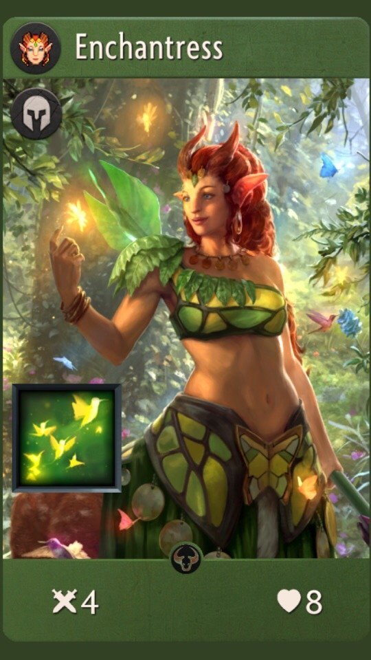 Зеленый герой Enchantress: Герой имеет 4 единицы атаки и 8 единиц здоровья.