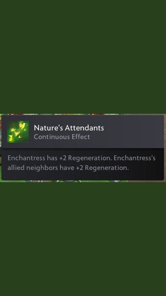 Enchantress. Nature Attendants: Enchantress и ее союзные соседи получают +2 к регенерации здоровья.