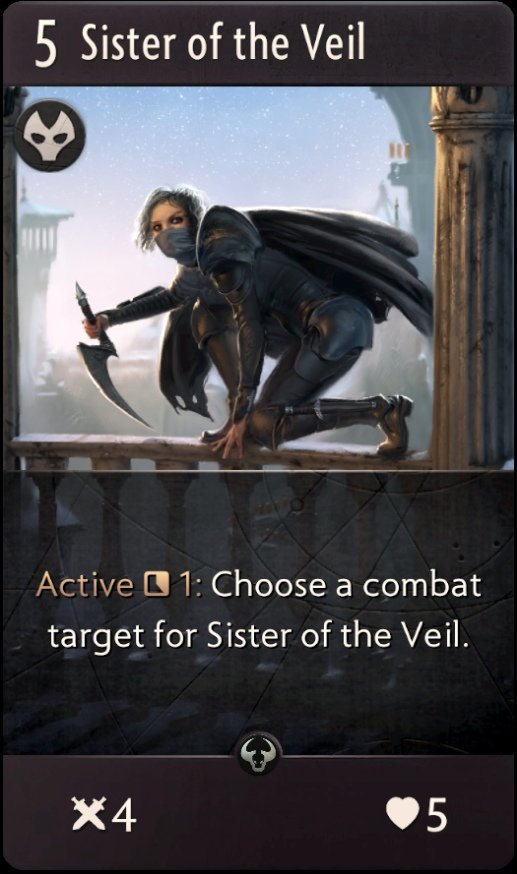 Черное существо Sister of the Veil. Стоимость – 5 маны, имеет 4 единицы атаки и 5 здоровья.Активная способность: Выберите цель, с которой Sister of the Veil вступит в бой. Перезаряжается 1 ход.