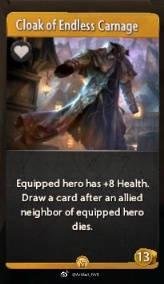 Cloak of Endless Carnage. Предмет. Герой, который его экипировал, получает +8 к здоровью. Вытягивает карту после того, как погибает союзник, стоящий рядом с героем.