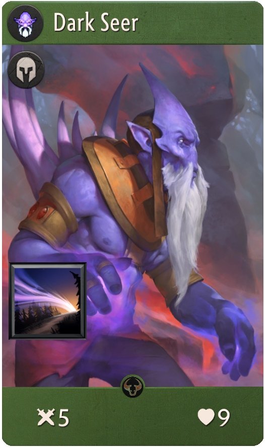 Dark Seer. Зеленый герой, имеющий 5 единиц атаки и 9 единиц здоровья. Обладает способностью Surge, которая при активации перемещает союзника на другую линию.