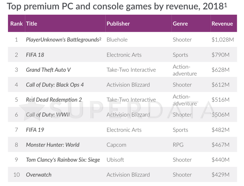 1. PUBG – 1,028 млрд 2. FIFA 18 – 790 млн3. Grand Theft Auto V – 628 млн4. Call of Duty: Black Ops 4 (вышла в октябре) – 612 млн5. Red Dead Redemption 2 (вышла в октябре) – 516 млн6. Call of Dury WWII – 506 млн7. FIFA 19 (вышла в сентябре) – 482 млн8. Monster Hunter World (вышла в январе) – 467 млн9. Tom Clancy’s Rainbow Six Siege – 440 млн10. Overwatch – 429 млн