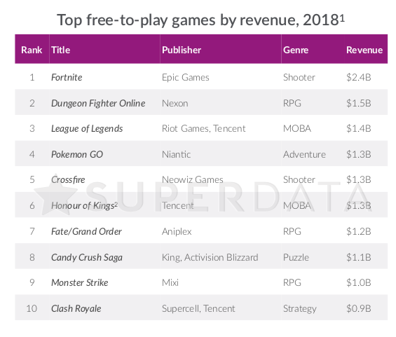 SuperData объявила топ-10 условно-бесплатных игр по доходу за 2018 год.