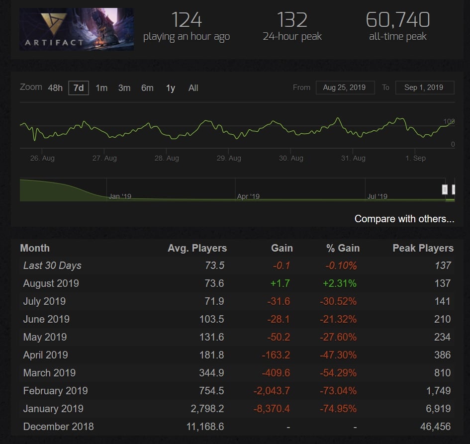 Онлайн вырос по сравнению с июлем на 1,7 человека, но пиковое число игроков упало со 141 до 137 человек. В начале прошлого месяца Artifact впервые с прошлого года прибавил в среднем онлайне.