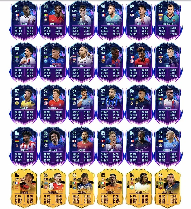 Нголо Канте («Челси») – 90-91Пауло Дибала («Ювентус») – 89-90Садьо Мане («Ливерпуль») – 89-90Уго Льорис («Тоттенхэм») – 89-90Сон Хын Мин («Тоттенхэм») – 88-89Жорди Альба («Барселона») – 88-89Маркиньос («ПСЖ») – 87-88Аллан («Наполи») – 86-87Рияд Марез («Манчестер Сити») – 86-87Мемфис Депай («Лион») – 86-87Усман Дембеле («Барселона») – 86-87Кингсли Коман («Бавария») – 86-87Алехандро Гомес («Аталанта») – 86-87Гарет Бэйл («Реал Мадрид») – 86-87Джейдон Санчо («Боруссия Д») – 86-87Леон Горетцка («Бавария») – 86-87Эдер Милитао («Реал Мадрид») – 84-86Хесус Корона («Порту») – 84-86Виллиан («Челси») – 84-86Идрисса Гуйе («ПСЖ») – 85-86Лукас Торрейра («Арсенал») – 84-86Томас Парти («Атлетико») – 84-86Антони Марсьяль («Манчестер Юнайтед») – 85-86Даниэль Васс («Валенсия») – 83-85Рауль Хименес («Вулверхэмптон») – 83-85Джо Гомес («Ливерпуль») – 83-85Жуан Жезус («Рома») – 81-84Кевин Мбабу («Вольфсбург») – 81-84Анхелиньо («Манчестер Сити») – 82-84Ибраима Конате («РБ Лейпциг») – 82-84