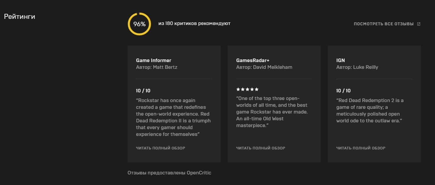 В нем приведены общая оценка игры, число рецензий и три цитаты из различных изданий. Пользователи могут перейти на сайт OpenCritic, чтобы увидеть остальные отзывы. О работе над подобным функционалом Epic Games сообщила в октябре 2019 года, когда объявила о партнерстве с OpenCritic.