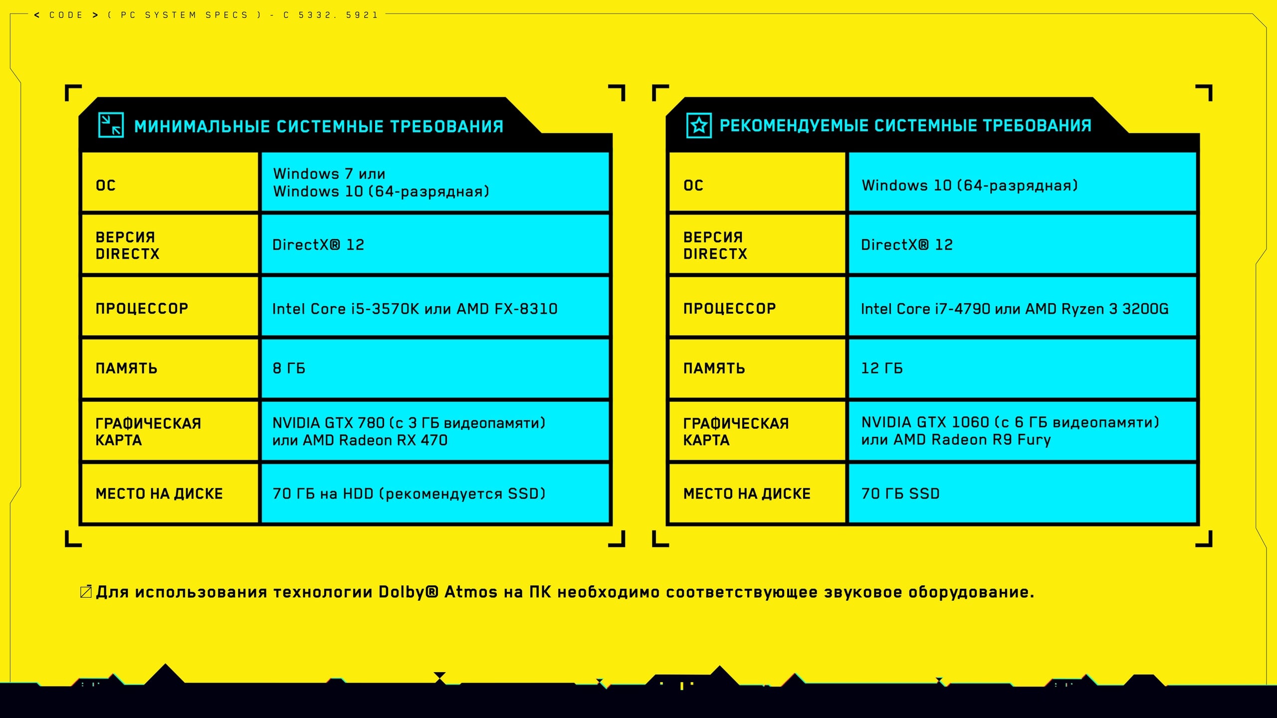 ОС: Windows 7 x64 или Windows 10 x64Версия DirectX: DirectX 12Процессор: Intel Core i7-4790 или AMD Ryzen 3 3200 GГрафическая карта: GeForce GTX 1060 или Radeon R9 FuryПамять: 12 гигабайтМесто на диске: 70 гигабайт SSD