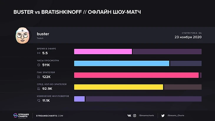 По данным Streams Charts, 22 ноября за шоу-матчем между Freak Squad (командой Бустера и Егора Крида) и 89 Squad (командой Владимира Братишкина) по CS:GO наблюдали 121 922 человека. Это – новый рекорд канала и абсолютный рекорд по зрителям среди русскоязычных соло-стримеров (не считая каналы студий и турнирных операторов).