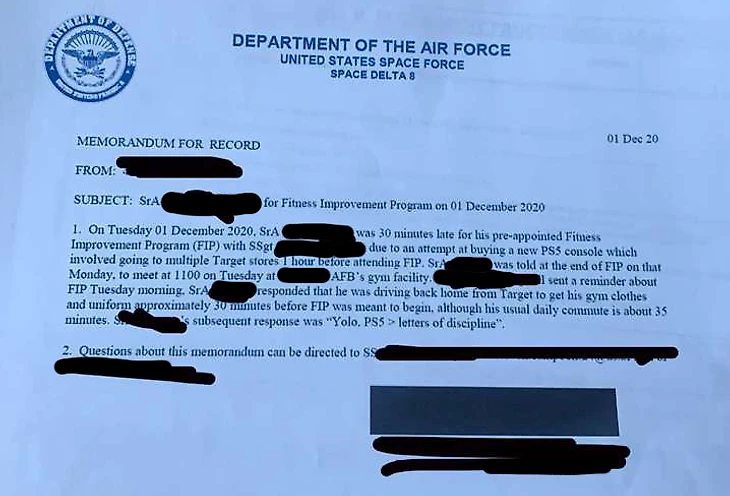 Всему виной – желание приобрести PS5. Согласно рапорту, солдат опоздал на тренировку, а когда ему вынесли замечание, он заявил: «:Живем лишь раз, PS5 важнее чем выговоры». Летчик задержался и не успел на занятие из-за дефицита консолей.