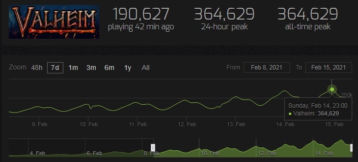 Онлайн симулятора выживания о викингах Valheim превысил 364 тысячи игроков.