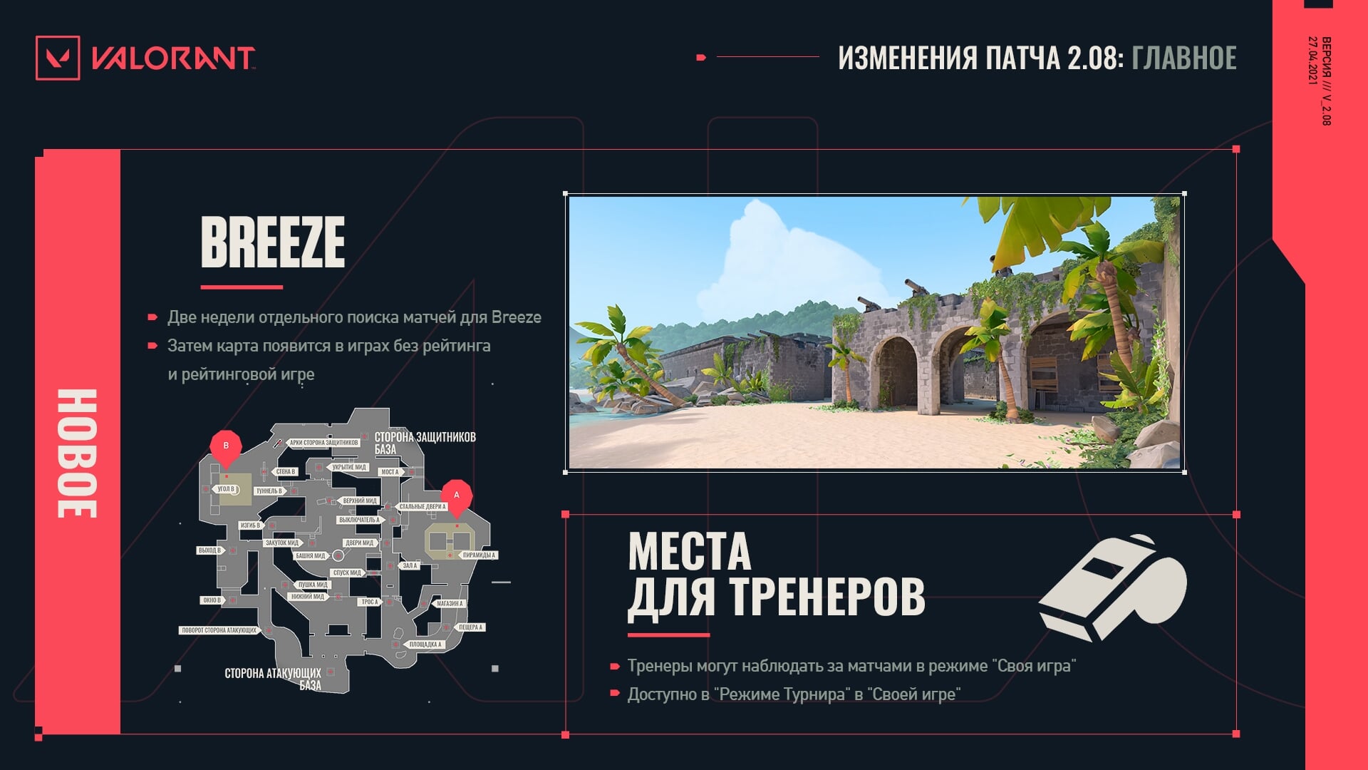 Riot Games выпустила патч 2.08 для Valorant, в котором добавила карту Breeze, а также добавила слот для тренеров.