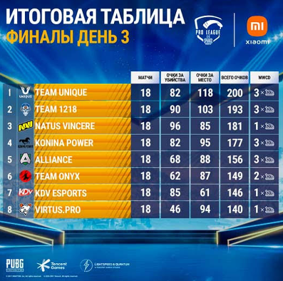 Общее количество очков Unique за 3 игровых дня составило 200 очков. Team 1218 набрала 193 балла и стала второй, NAVI заняла третью строчку, набрав 181 очко. При этом, они стали лучшими на СНГ-турнире по количеству набранных баллов за убийства (96).