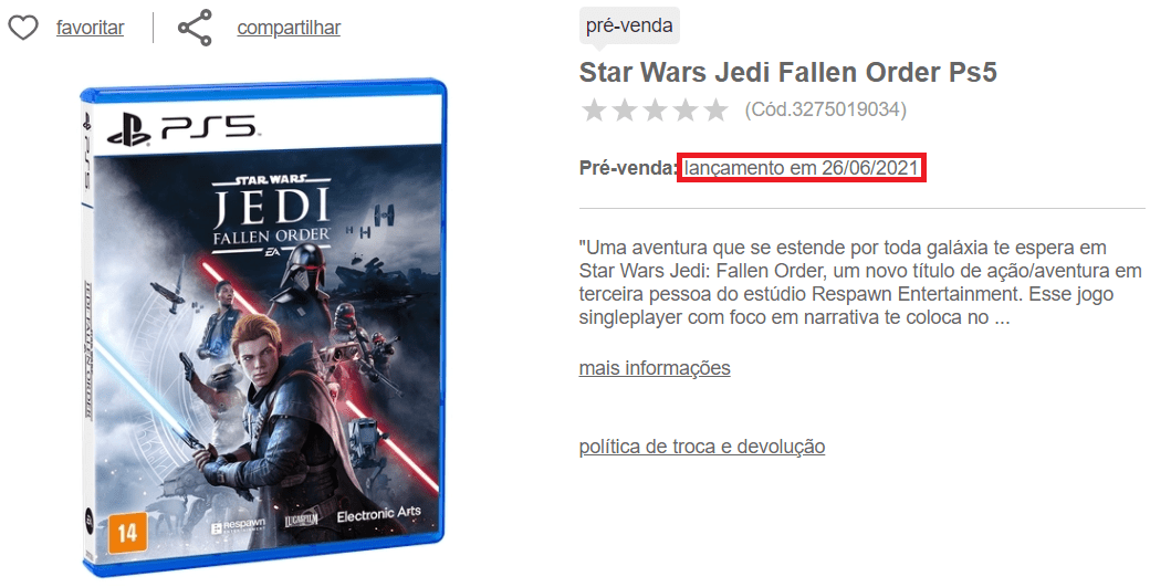 На сайтах бразильский магазинов Americanas и Submarino появились страницы Star Wars Jedi: Fallen Order для консолей нового поколения.