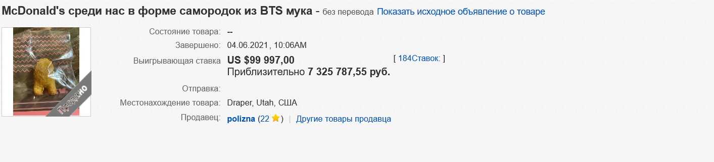 Изначально продавец из штата Юта, США, поставил лот на торги за 99 центов. Однако цена быстро возросла после того, как один из покупателей поставил цену в 15 тысяч долларов.
