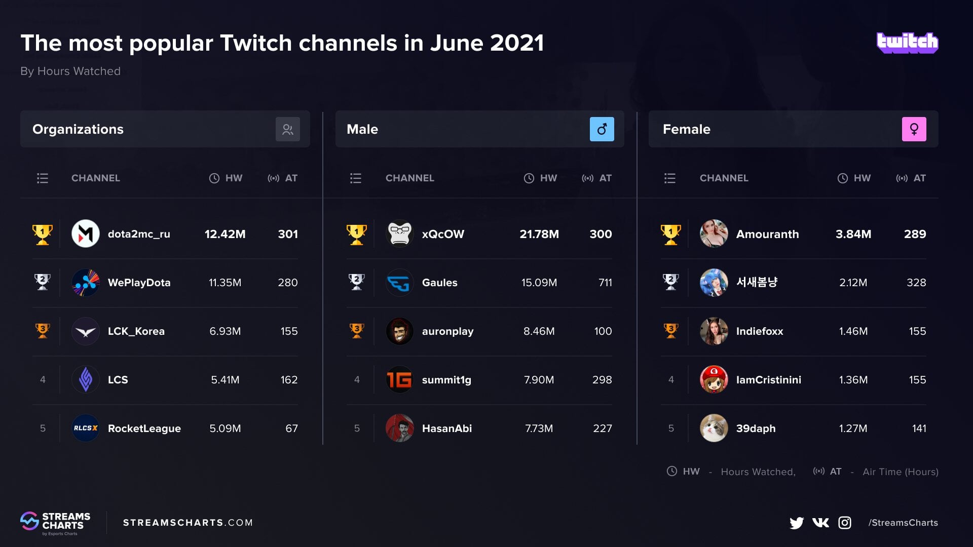 Сайт Streams Charts опубликовал статистику самых популярных каналов на Twitch в июне.