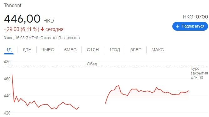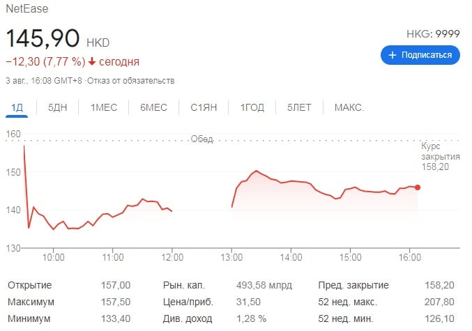 На утро 3 августа, акции Tencent торгуются за 446 гонконгских долларов (~57 долларов), а стоимость акции NetEase составляет 146 гонконгских долларов (~18 долларов).