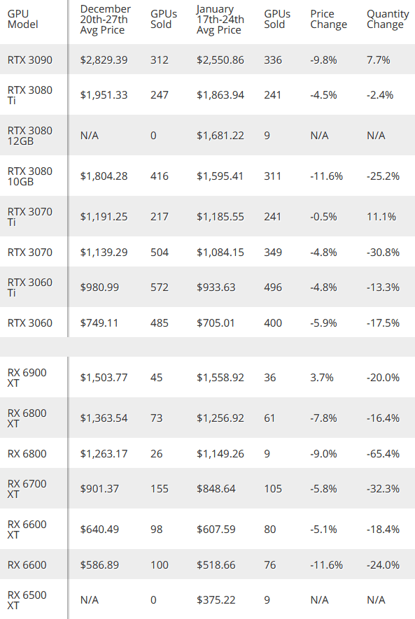 На фоне падения криптовалют сайт Tom’s Hardware проанализировал изменение цен на видеокарты на eBay за последнюю неделю. В среднем, видеоадаптеры подешевели на 5-11%, а самое большое падение цен показали Nvidia RTX 3080 (10 ГБ) и AMD RX 6600.