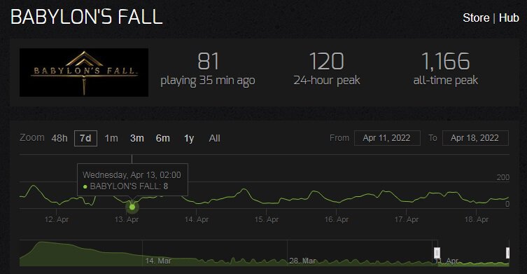 Онлайн Babylon’s Fall в Steam упал до 8 человек. Игра вышла 3 марта.