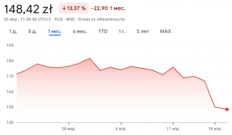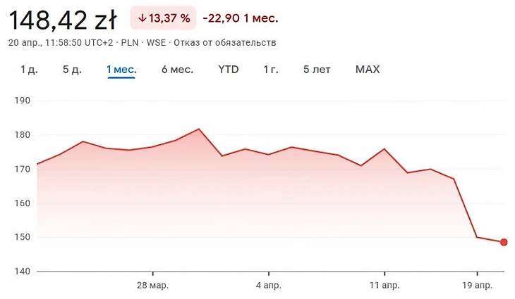 За последние сутки стоимость акций CD Projekt упала более чем на 10 процентов.