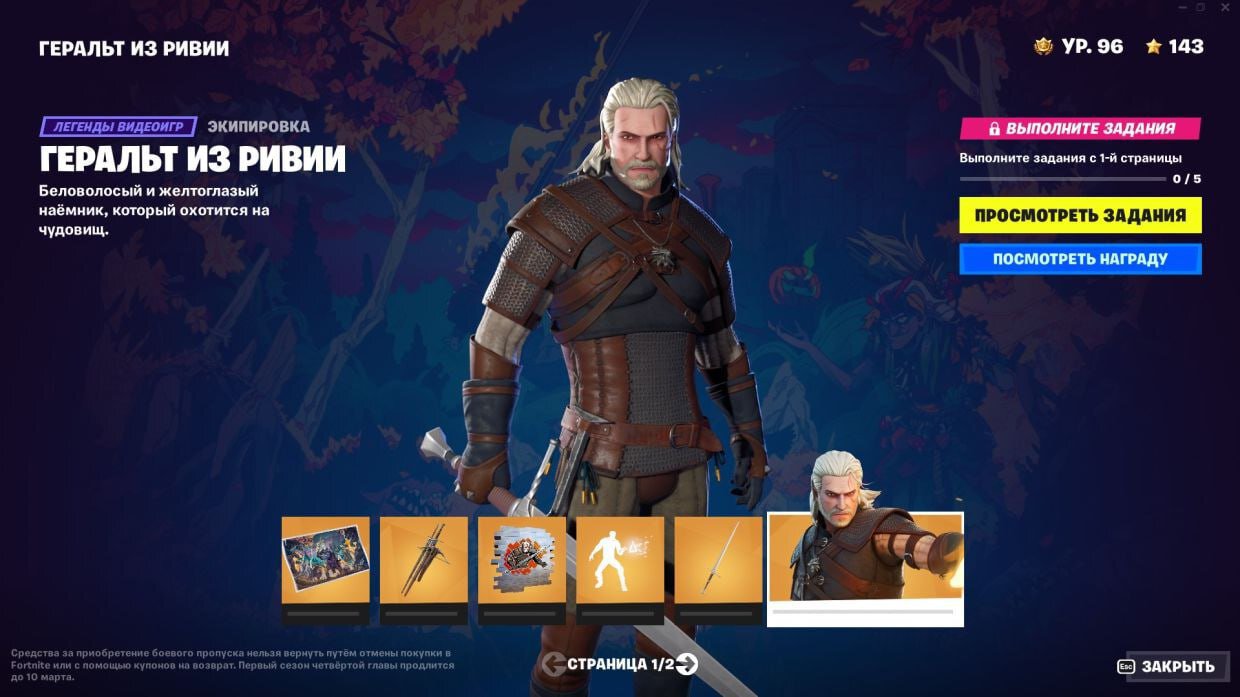 Скин Геральта из «Ведьмака» появился в Fortnite. Он стал доступен по боевому пропуску.