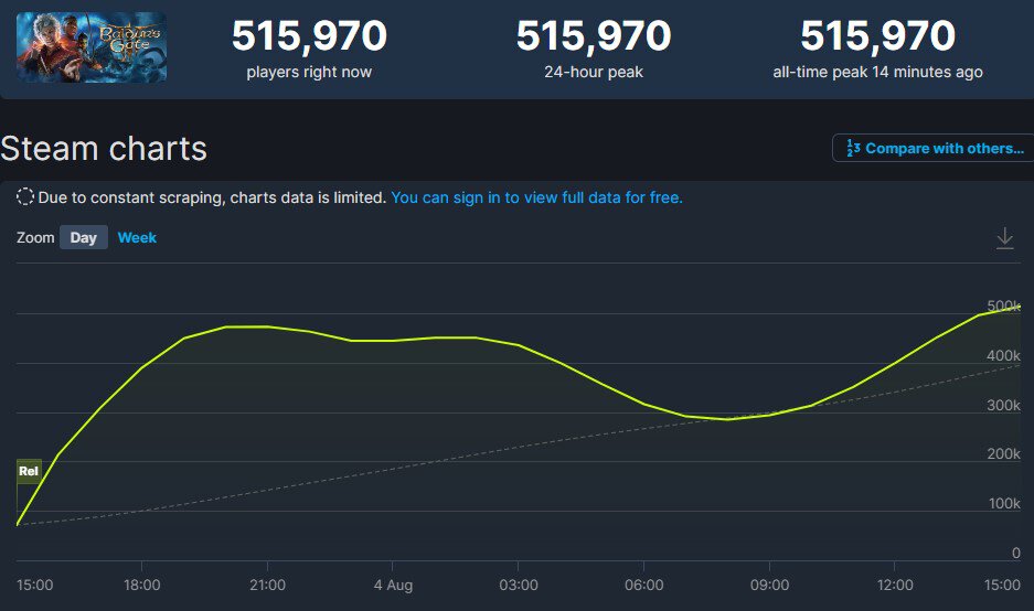Релиз Baldur’s Gate 3 состоялся 3 августа. В этот день пиковый онлайн составлял 470 тысяч.