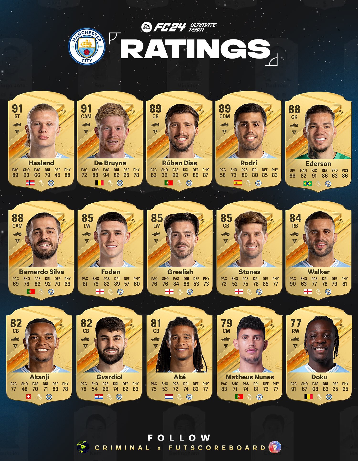 Инсайдер под ником Fut Scoreboard показал игроков «Манчестер Сити» в FC 24 с самым высоким рейтингом.