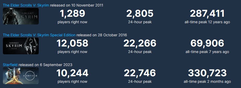 Starfield стал уступать Skyrim по онлайну в Steam.
