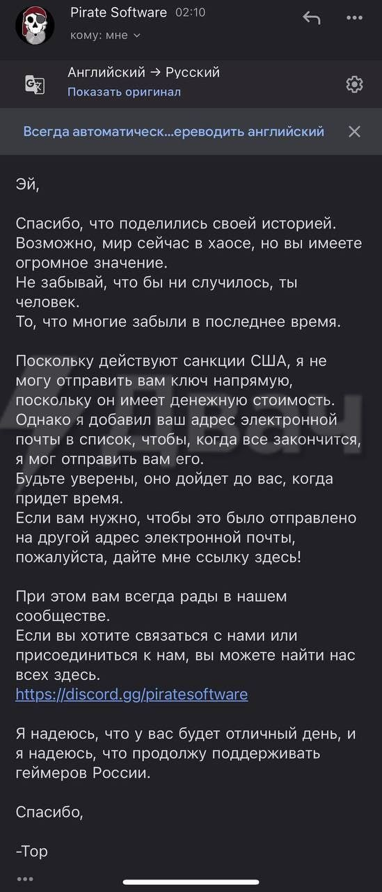 После этого в сети стали появляться скриншоты с ответом разработчика, который говорит, что из-за санкций США не может отправить ключ игры.
