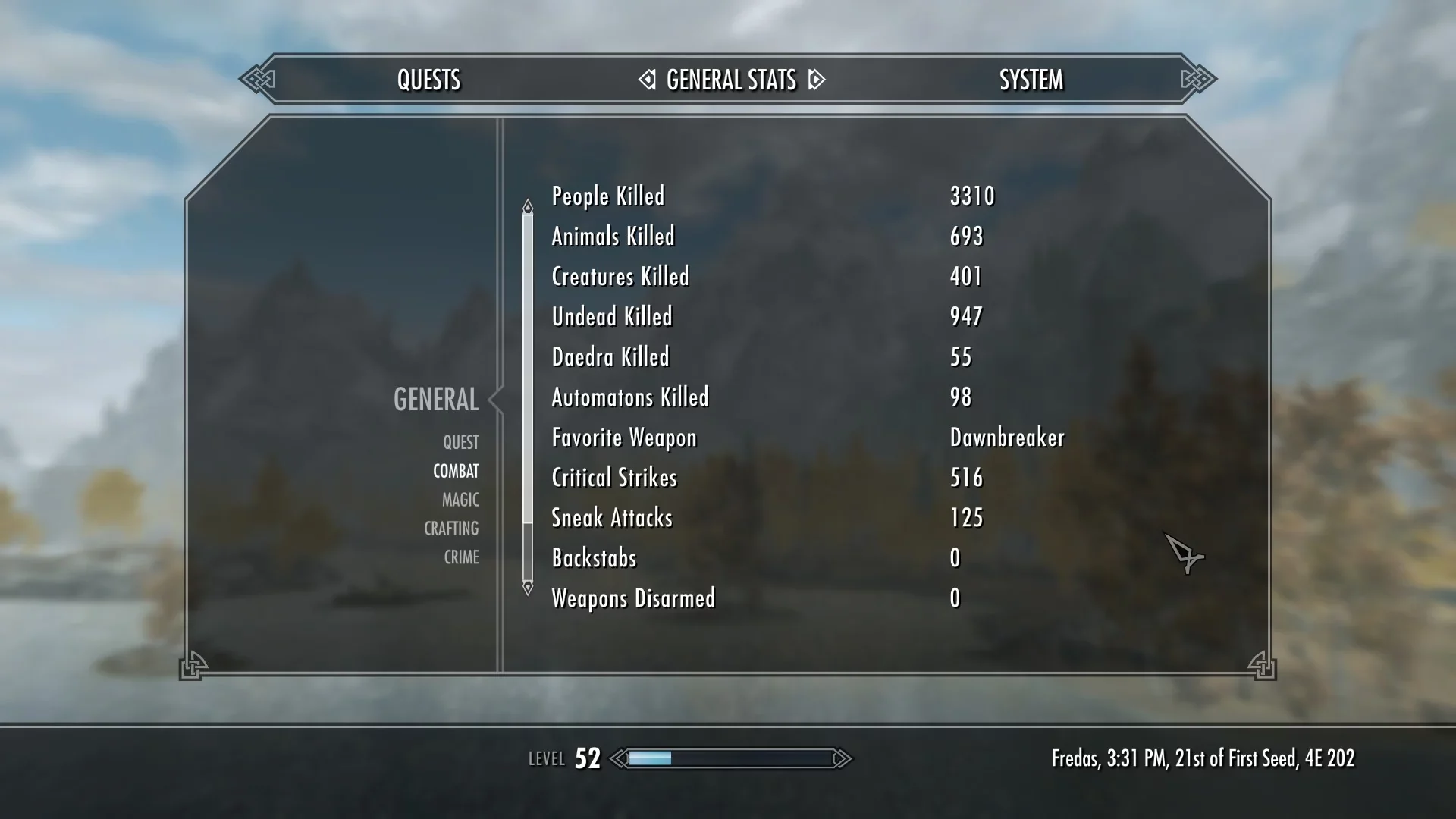 Из нее следует, что игрок убил в Skyrim более 5,4 тысячи NPC: 3310 людей, 693 животных, 401 существо и так далее. Награда за голову игрока – 267 тысяч золотых, но получить ее некому, так как все стражи в игре убиты.