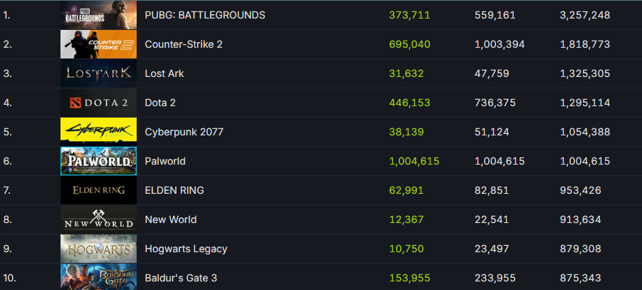 Palworld вышла на 6-е место по онлайну в Steam.