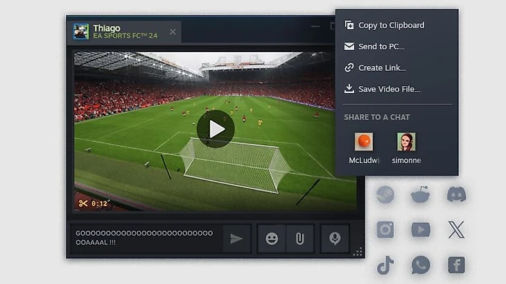 Пользователи платформы смогут делиться клипами в сообществе Steam. Также будет возможность отправлять клипы друзьям в чате или сохранять себе.