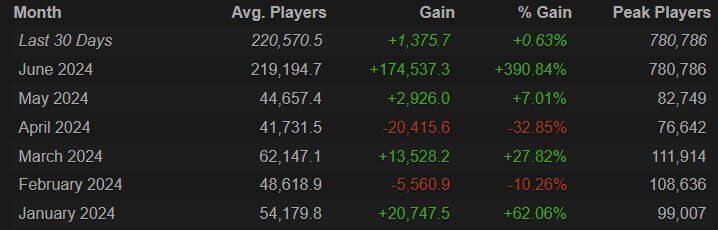 В среднем, в июне в Elden Ring заходили 219 тысяч игроков – это на 174 тысячи или на 390% больше, чем в мае. Онлайн в пике составил 780 тысяч игроков.