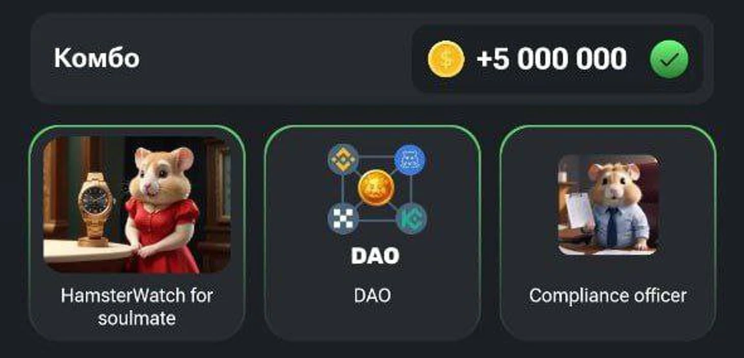 Каждые несколько дней в разделе Mine появляется новое комбо. Это секретная комбинация карт, которую нужно собрать (купить все три карточки) в Hamster Kombat для получения бонуса в 5 млн монет.