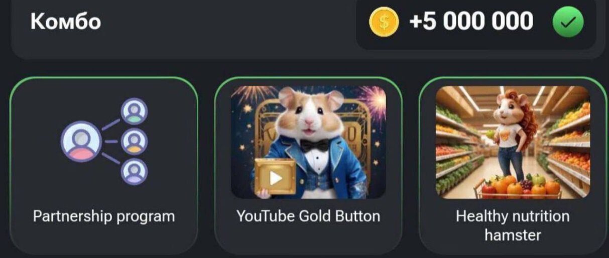 Каждые несколько дней в разделе Mine появляется новое комбо. Это секретная комбинация карт, которую нужно собрать (купить все три карточки) в Hamster Kombat для получения бонуса в 5 млн монет.