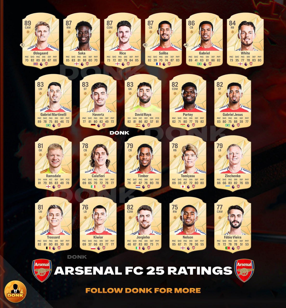 Лучшим игроком «Арсенала», вероятно, станет Мартин Эдегор (89). Рейтинг 87 получат Букайо Сака, Деклан Райс и Вильям Салиба. Ожидается, что Александр Зинченко получит карточку левого защитника с рейтингом 79.