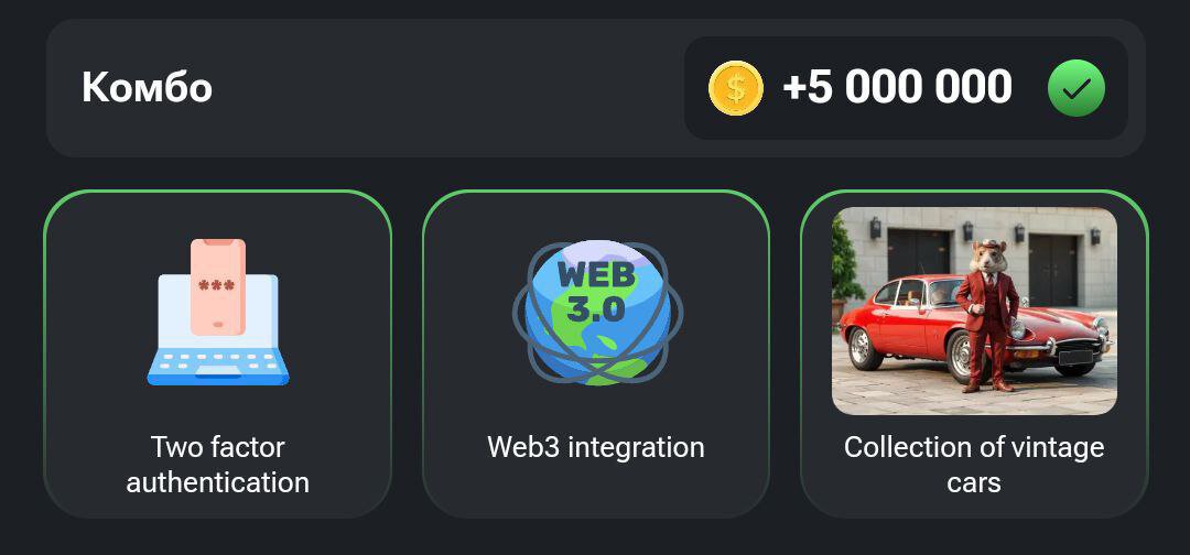 Каждые несколько дней в разделе Mine появляется новое комбо. Это секретная комбинация карт, которую нужно собрать (купить все три карточки) в Hamster Kombat для получения бонуса в 5 млн монет.