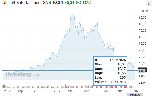 Акции Ubisoft упали до отметки в 10,34 евро. Это рекордно низкая стоимость с декабря 2013 года