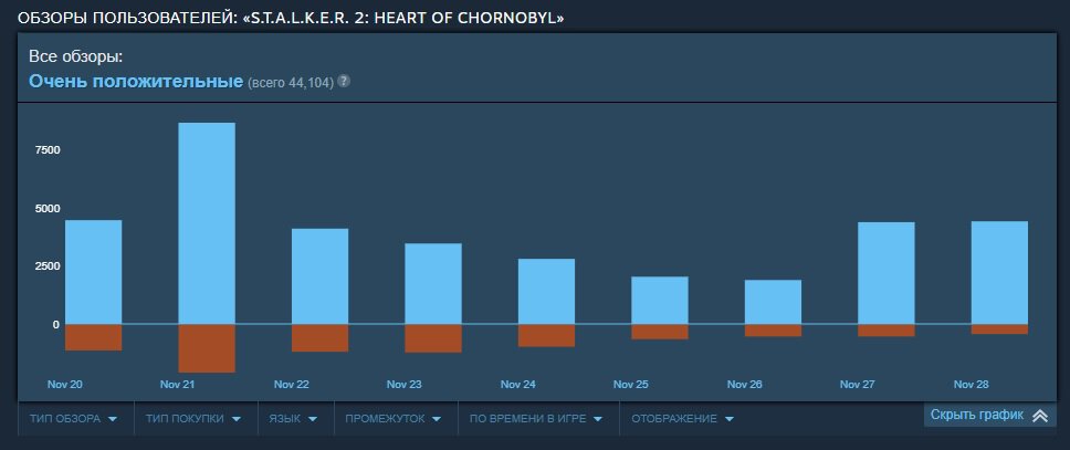 Теперь отзывы на игру отмечены как «очень положительные». Большое число положительных оценок «Сталкер 2» получил 27 и 28 ноября, при этом количество отрицательных отзывов осталось таким же. Основная часть обзоров в эти дни – на украинском языке.