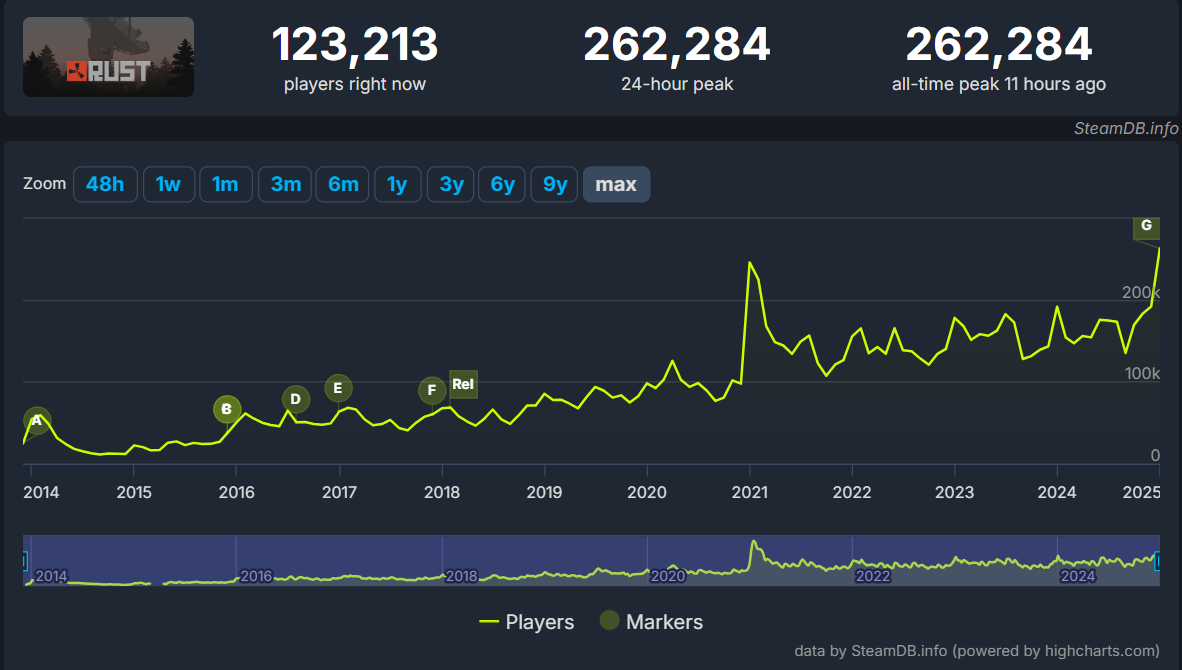Rust обновила рекорд по онлайну спустя 11 лет с момента выпуска – более 260 тысяч игроков