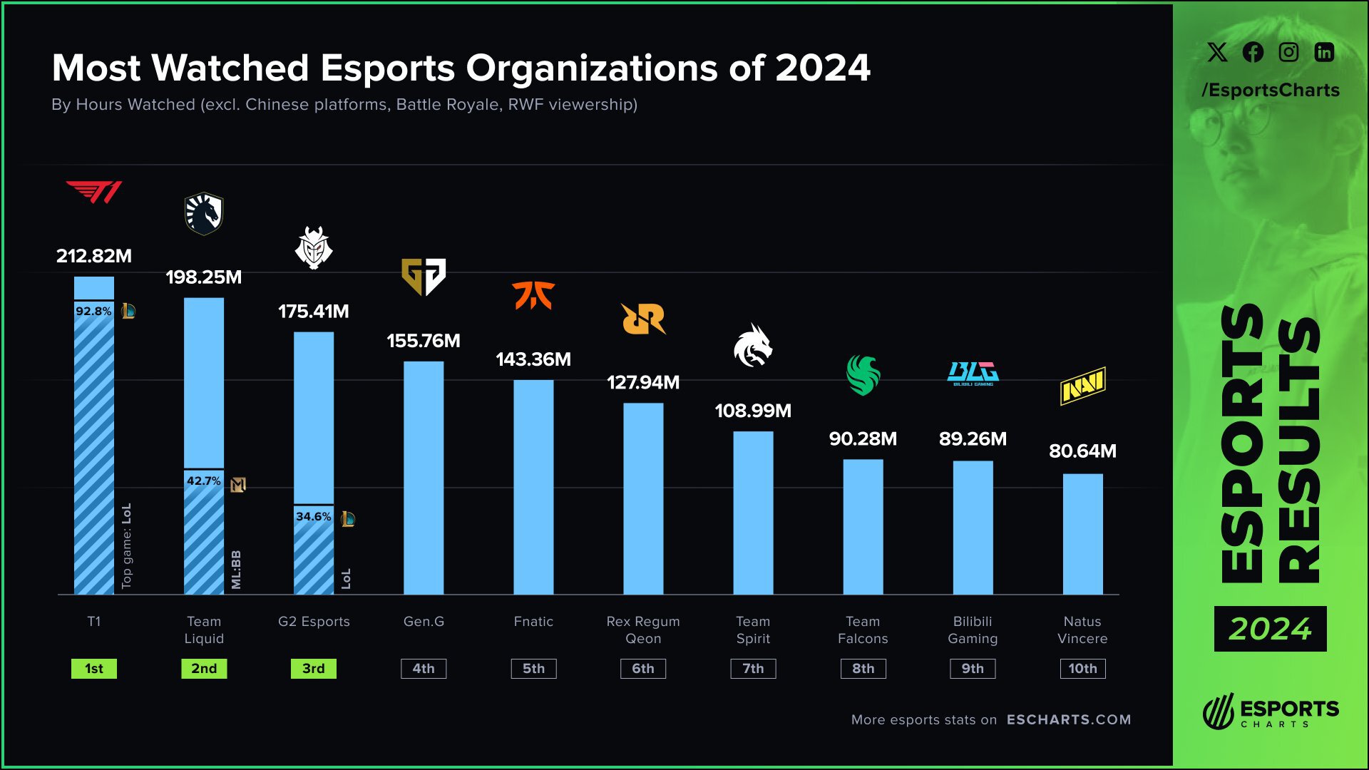 На первой строчке в очередной раз оказалась T1 – более 212 млн просмотров. Следом идут Liquid (198,25 млн) и G2 (175,41 млн).